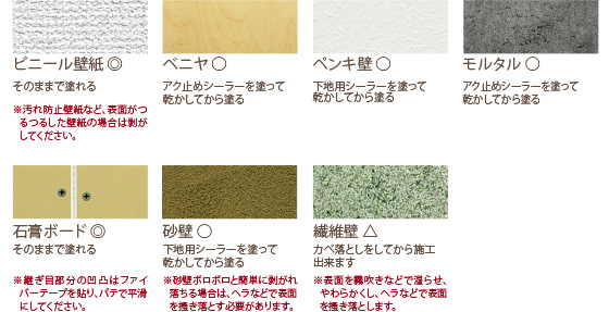 テンコー装飾の資料によると、以下のような下地に対応しています。
